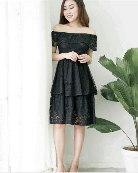 Còn cô, cô mặc trên người bộ váy trễ vai màu đen
