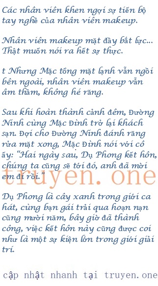 Hai người ôm nhau nồng nhiệt, một lúc sau Mặc Đình bình tĩnh _ trở lại, nhân viên makeup một lân nữa quay lại phòng hóa trang, tuy nhiên nhân viên makeup chắc chắn rằng dấu hôn trên người Đường Ninh không còn cần đến kỹ năng trang điểm của mình nữa.
