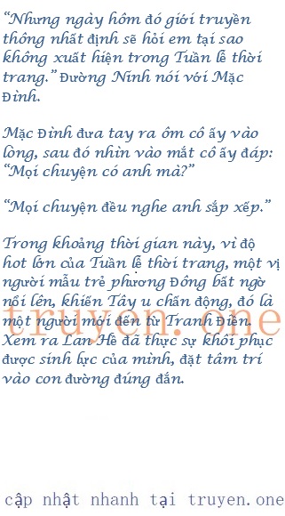 Đường Ninh ừ nhẹ một tiếng, cúp điện thoại im lặng chờ đến lúc diễn, nhưng trong khoảng thời gian này, Đường Ninh mở điện thoại ra theo dõi các video catwalk của các thương hiệu lớn trong Tuần lễ thời trang này.