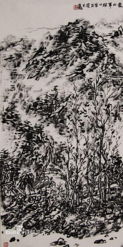 Dãy núi trùng điệp, thảo đình thấp thoáng giữa rừng cây núi đá, cánh rừng sum suê như ẩn như hiện dưới ngọn núi. Cây cầu bắc ngang khe suối, phong cảnh um tùm một màu xanh sẫm. Nhuận bút* và bút khát mực** tôn lên điểm đặc sắc của nhau, một bên âm u thăm thẳm hòa hợp một bên ẩn sâu tâm ý cô tịch.
