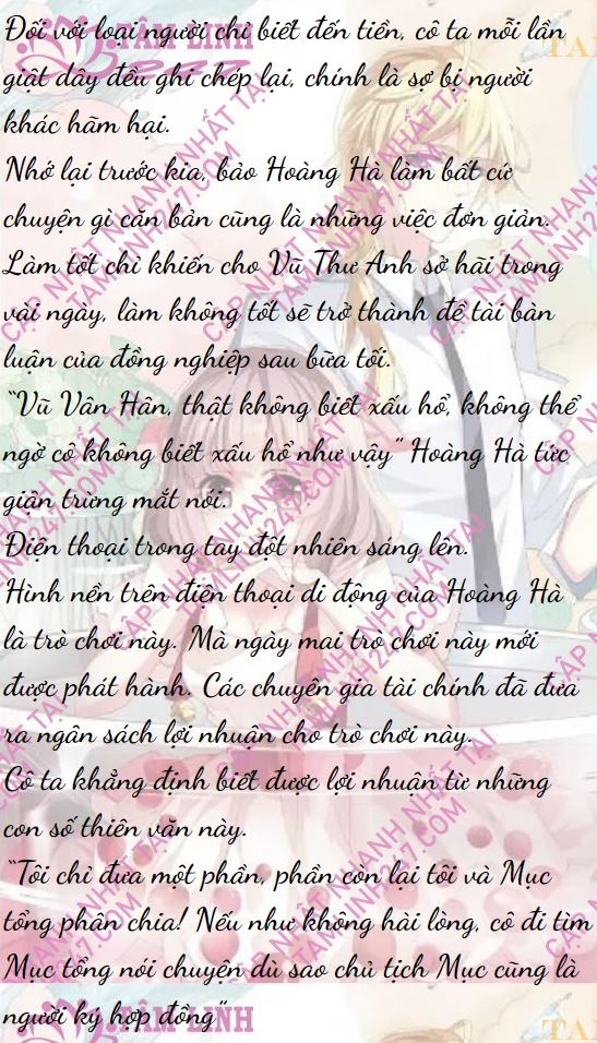 Vũ Vân Hân đã điều tra qua bất kỳ khoản đầu tư nào do Mục Lâm Kiên thực hiện đều nhất định sẽ mang lại lợi nhuận lên gấp nghìn lần. Đến lúc đó, trò chơi này chắc chắn sẽ phủ sóng toàn thế giới, chỉ cần có điện thoại thông minh thì có thể download trò chơi này rồi. Căn cứ vào số tiền kiếm được từ số lượng truy cập chắc chắn là sẽ đại thắng.
