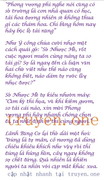 Như Ý công chúa nói: “Vàn đầu tiên, so tài về y thuật, là sở trường của Phong vương phi, Sở cô nương chủ động nhận thua. Thế ván thứ hai này, so về sở trường vẽ tranh của Sở Nhược Hề cô nương đi, hai người tranh tài, phác họa chân dung lẫn nhau, ai vẽ càng giống hơn thì sẽ quyết định thắng thua, như thế cũng khá là công bằng nh Hai người ai cũng không có ý kiến gì, lập tức lệnh cho người hậu lấy ra giấy và bút, mực, cơm trên bàn thoáng đã được thu dọn, sau đó lại trải ra nghiên mài mực, chuẩn bị bắt đầu.