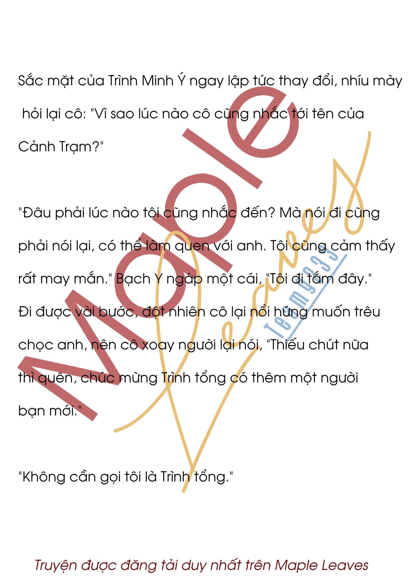 Trình Minh Ý hơi giận dỗi xoay người nhìn sang chỗ khác, mấy phút sau anh quay lại chỉ nhìn thấy bóng lưng Bạch Y đang bước đi chậm, cô bước vào phòng tắm. Ngay sau đó, anh nghe thấy tiếng nước từ trong phòng tắm truyền ra.