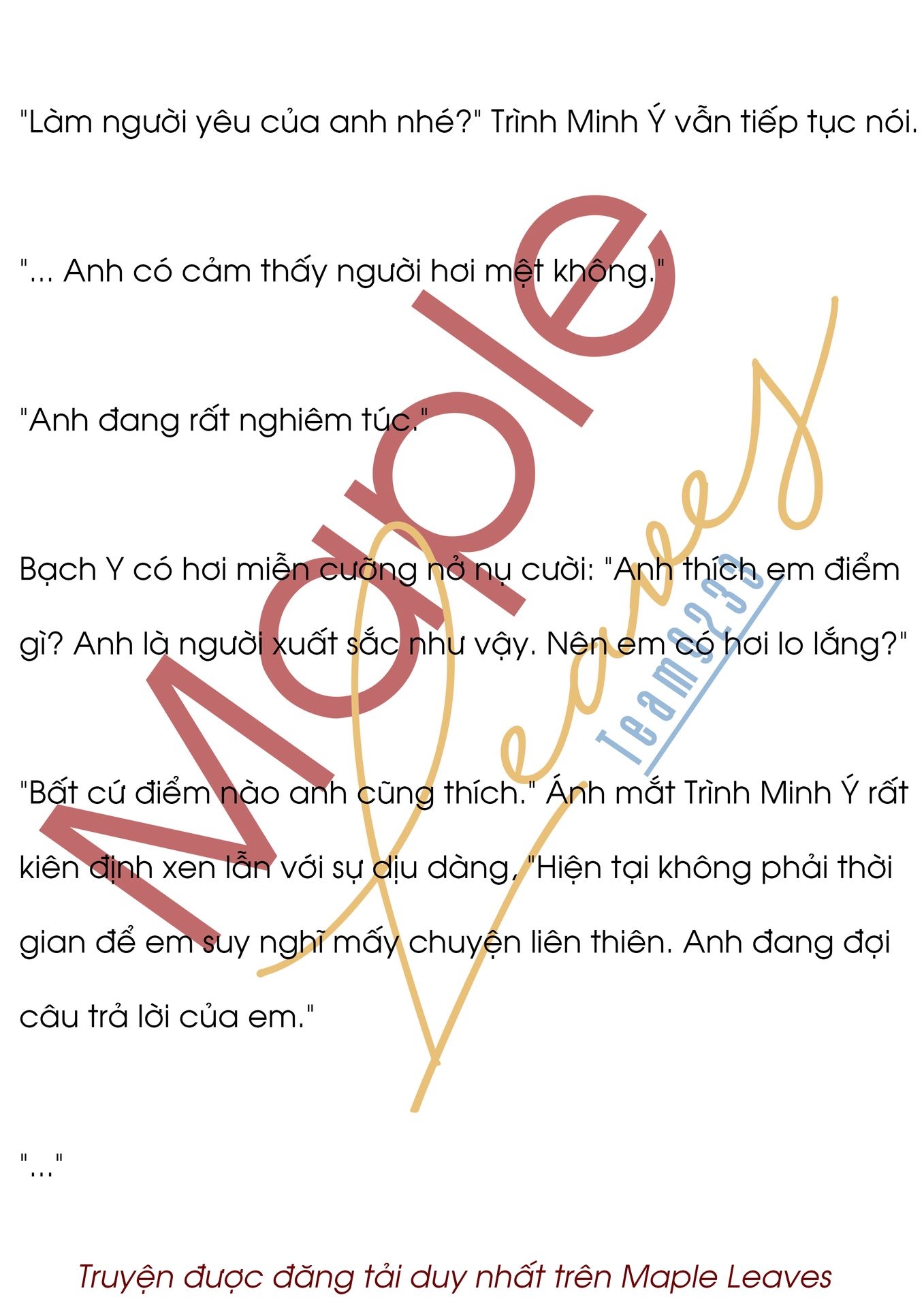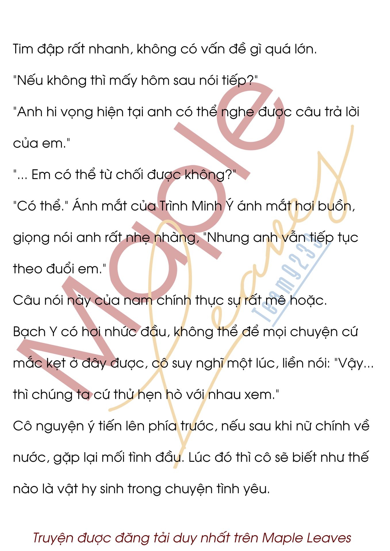 "Bất cứ điểm nào anh cũng thích." Ánh mắt Trình Minh Ý rất kiên định xen lẫn với sự dịu dàng, "Hiện tại không phải thời gian để em suy nghĩ mấy chuyện liên thiên. Anh đang đợi câu trả lời của em."