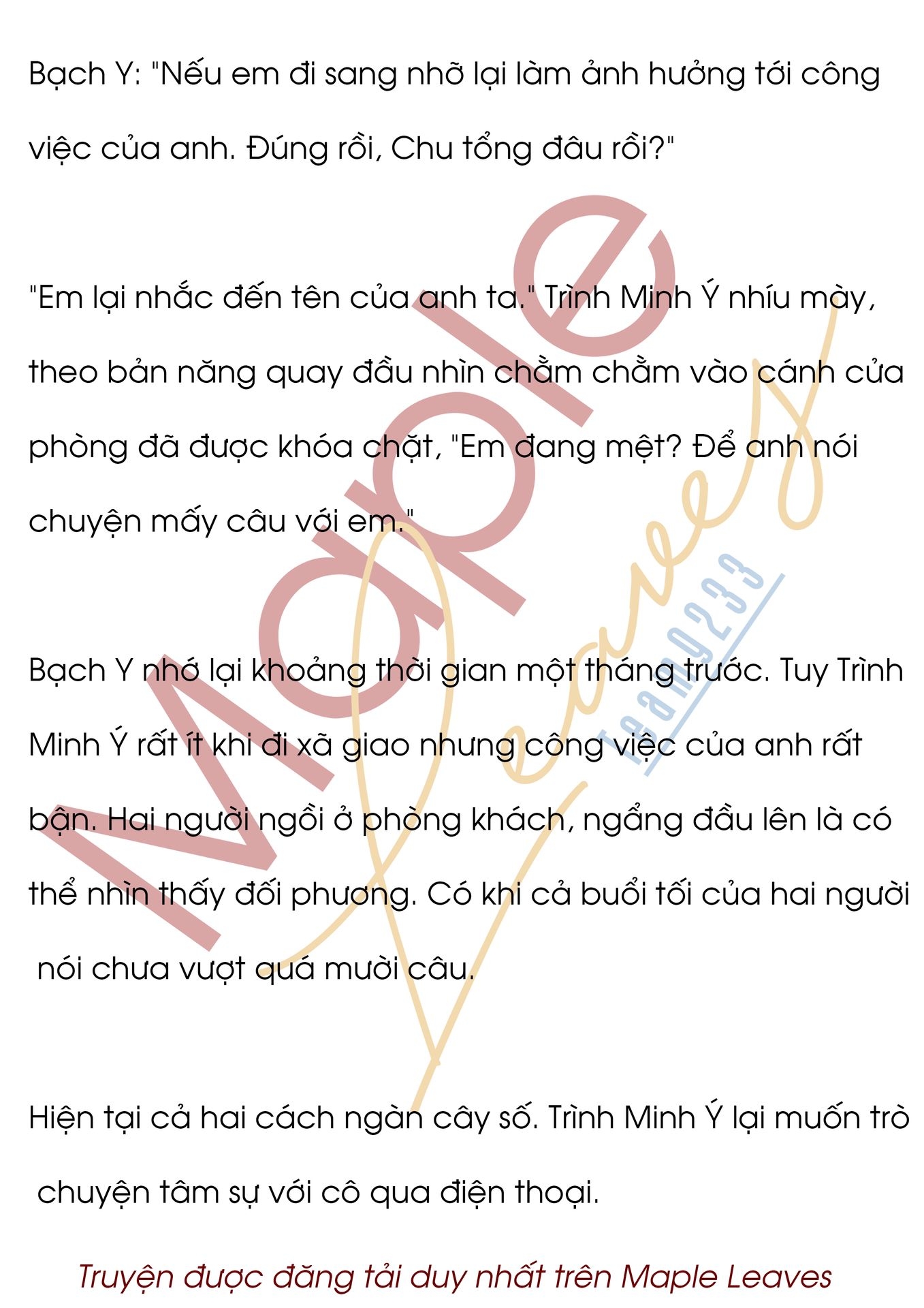Hai người lại hàn huyên tâm sự một lúc rất lâu. Bạch Y kể cho anh nghe những câu chuyện thú vị xảy ra ở đoàn làm phim. Còn anh kể cho cô nghe tình hình của dự án xây dựng khu nghỉ dưỡng. Cho đến khi mí mắt của cô nặng trĩu, Trình Minh Ý muốn dỗ cô ngủ.