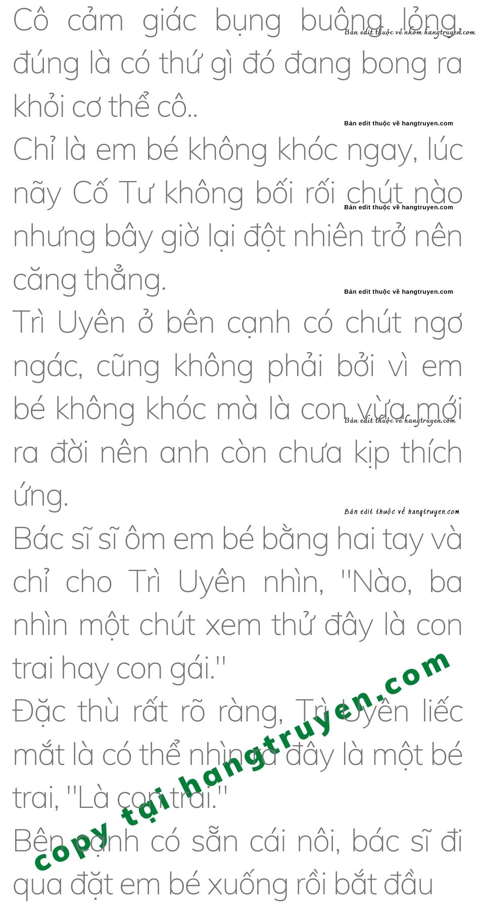 Cố Tư không có cảm giác gì, bởi vì không đau không ngứa cho nên cô không có cảm giác tâm lý sợ hãi. Thậm chí cô còn nhìn bác sĩ rồi hỏi, “Tôi thấy hơi đói, sinh xong là ăn được luôn đúng không?”