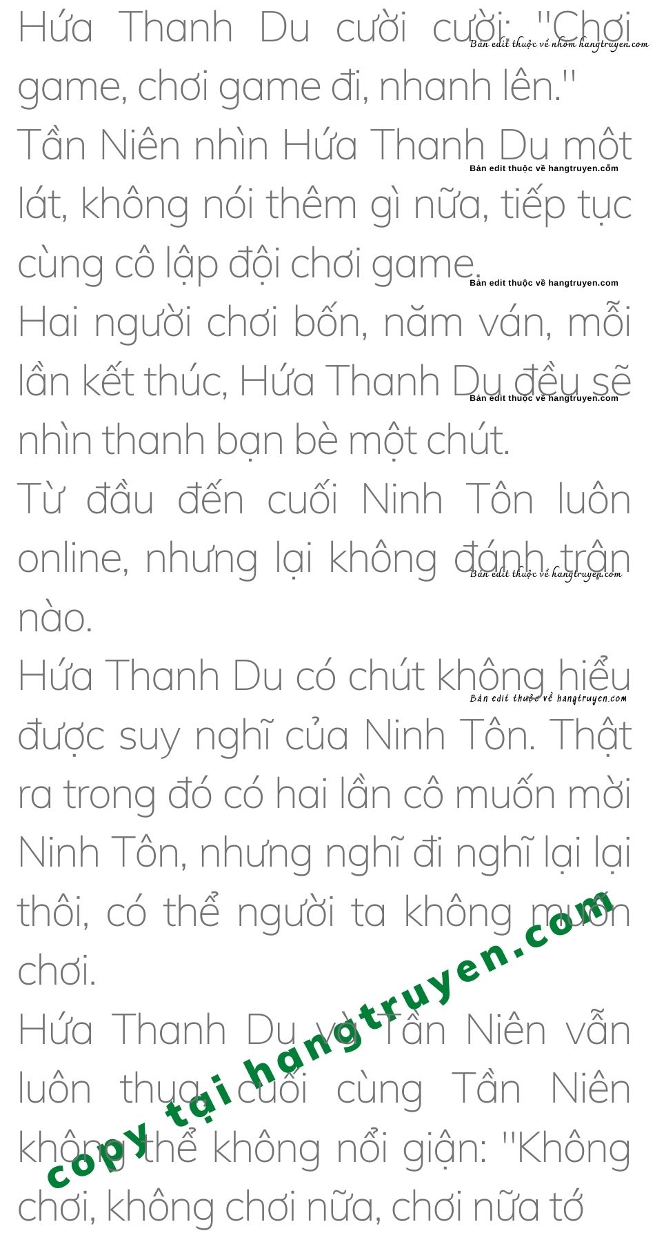 Hứa Thanh Du chẹp miệng: “Cả một buổi chiều cậu không có câu nào là không liên quan tới anh ấy. Hai chúng ta là hai chúng ta. Lúc hai chúng ta ở bên nhau đừng nhắc đến người khác có được không? Bạn thân yêu của tôi.”